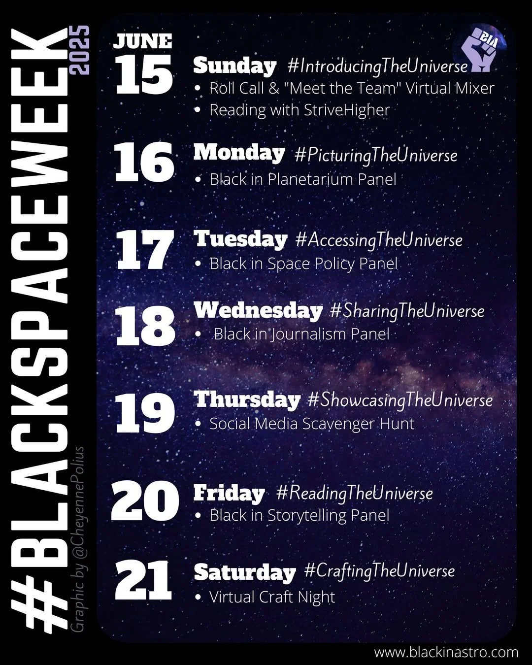 Black Space Week (BSW), presented by Black In Astro (BIA), is an annual global celebration and amplification of Black people in space-related fields and industries taking place the week of Juneteenth. BSW is a full week of primarily virtual programming concerning these fields, reminiscent of a virtual conference. Black Space Week events have included panel interviews, networking meet-and-greets, poetry readings, and more. Subject matter is intentionally broad and interdisciplinary, ranging from astrophysics research, to aerospace, to space humanities and intersections with the social sciences. The benefit of virtual events is accessibility to participants all around the world. Black folks are of course also doing the work behind the scenes, with the BIA Executive Board consisting of Black students and professionals in fields such as astrophysics, data visualization, and space law.